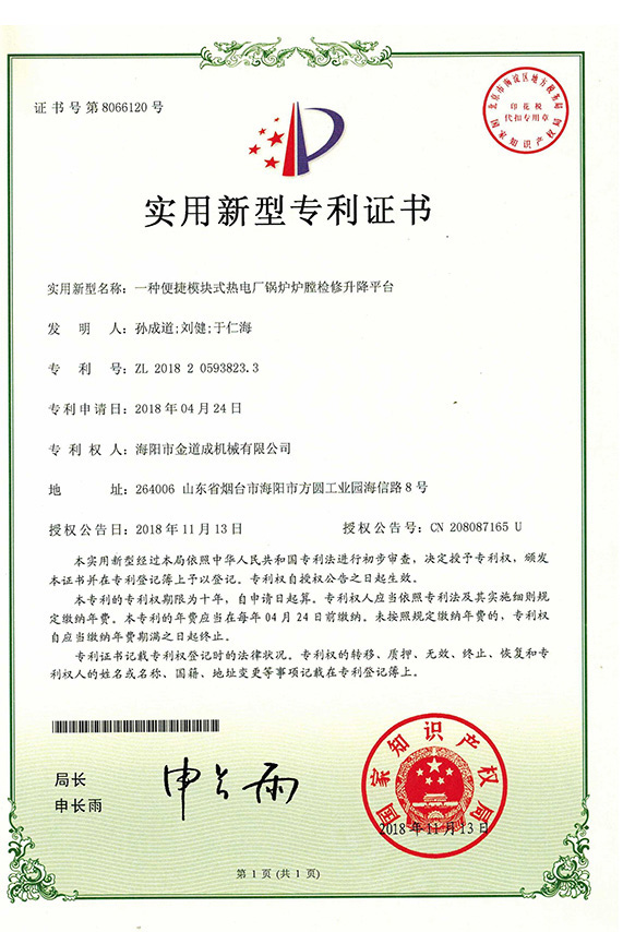 部件采用模块化设计成满膛结构,淘汰回型结构镂空的空缺(工作走台满膛平铺无盲区);去掉折叠平台走台上的斜拉索,设计成下撑杆式的折叠走台,极大地方便了工作走台上的人员无障碍行走。循环流化床锅炉可以直接在炉底风帽上组装完成,煤粉锅炉可以在运转层检修人孔以下0.5米左右的标高位置安装(可配套设置冷灰斗专用的我公司专利产品:煤粉锅炉灰口支撑平台),把检修升降平台由运转层平台人孔门运进炉内,直接在搭设好的灰口支撑平台上组装。